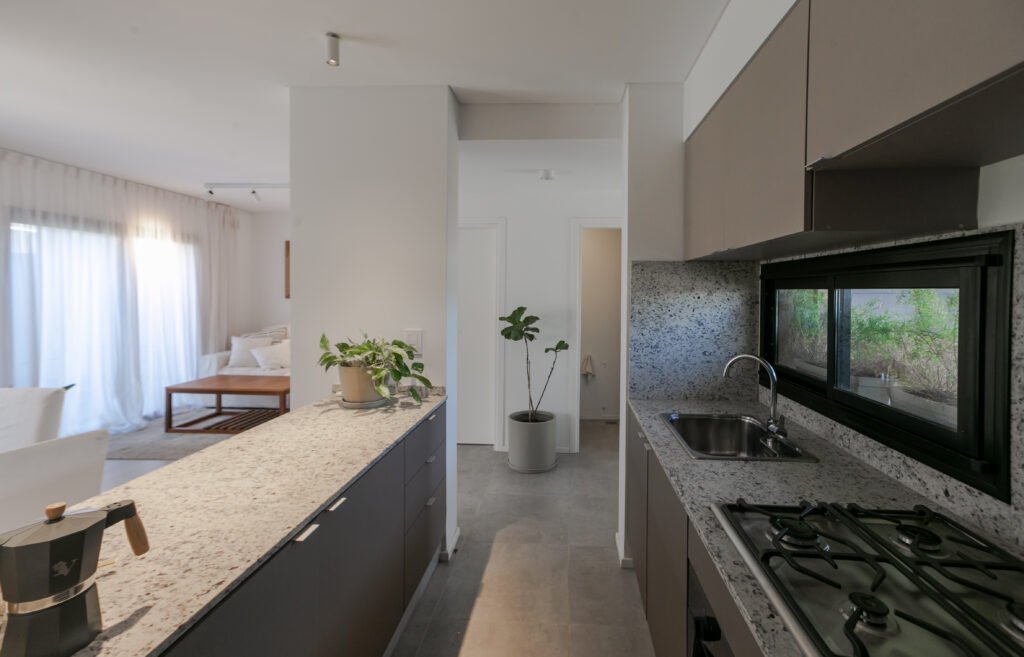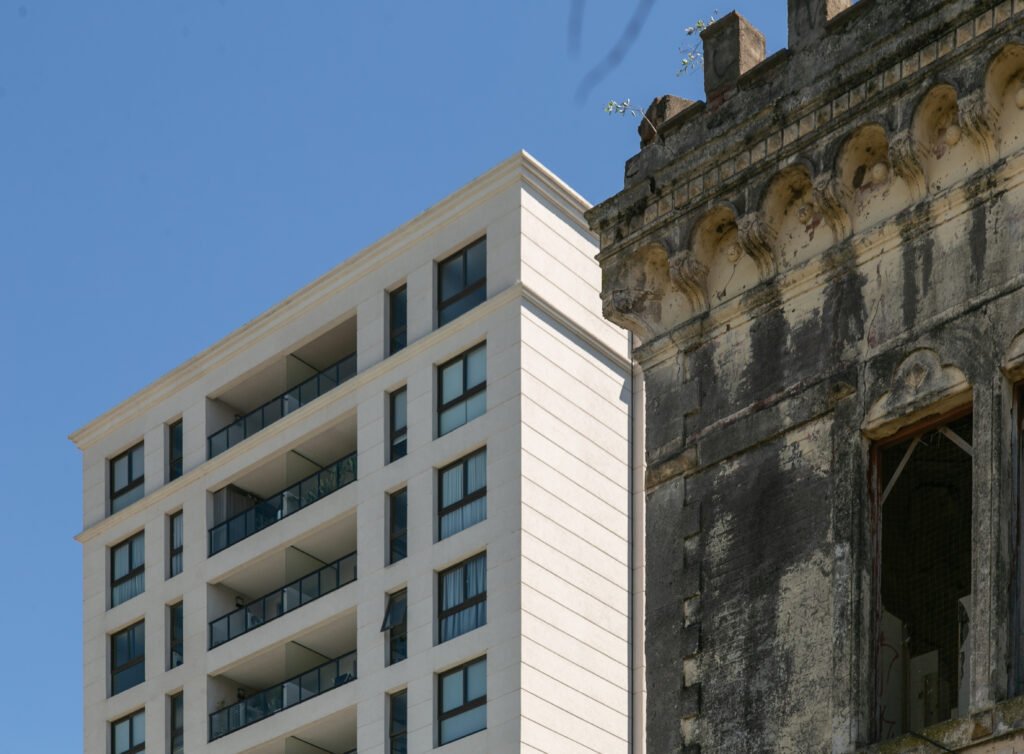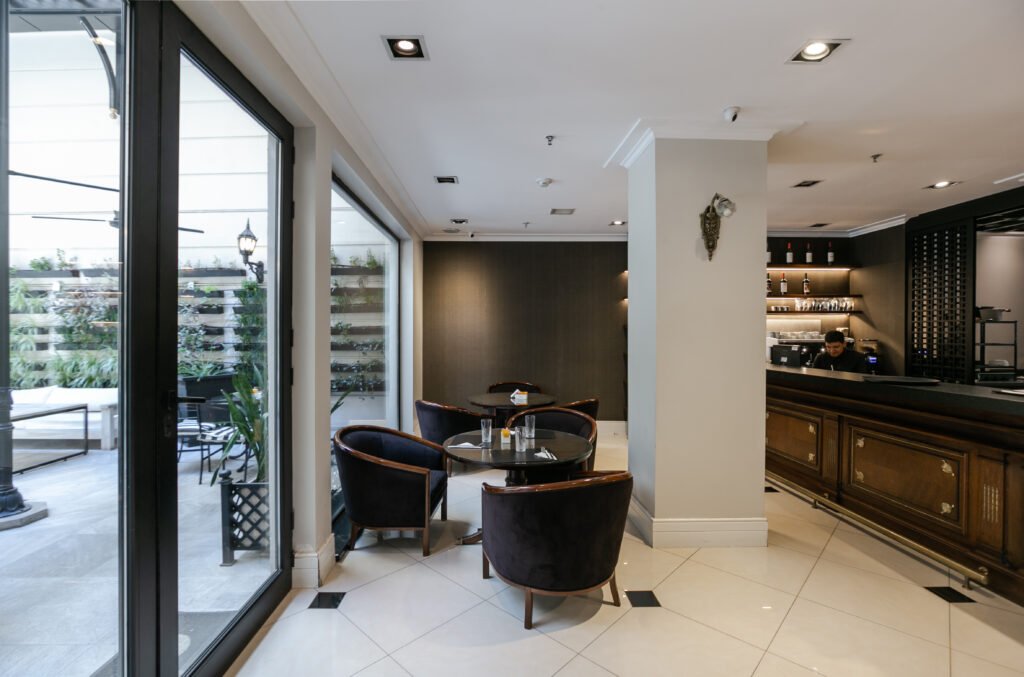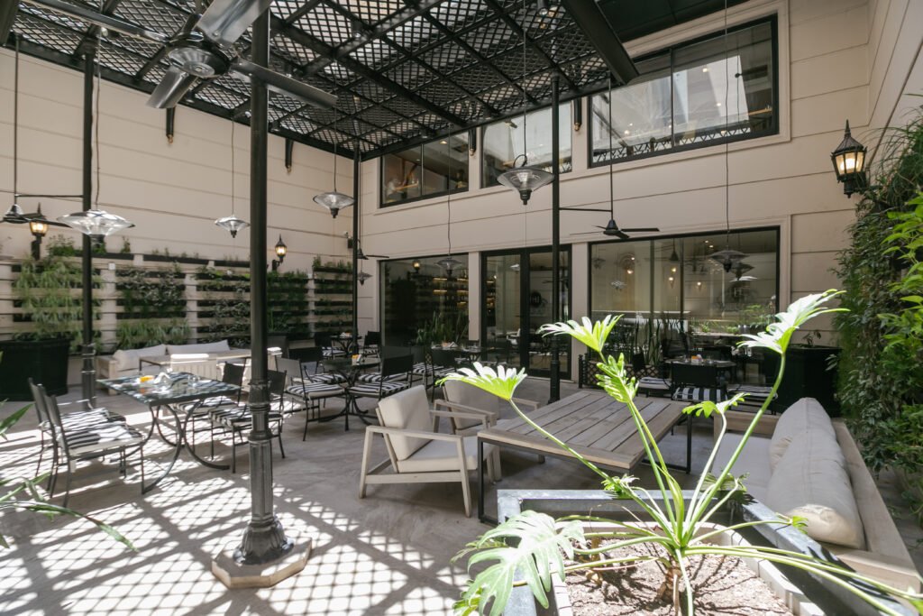 Tanto en el patio como en el interior de La Higuerita, se adoptó un lenguaje coherente con la arquitectura neoclásica del Amerian Executive Hotel. Se buscó una integración cercana con la intervención, cuidando cada detalle: desde los colores, el equipamiento y la vajilla, hasta la iluminación, los materiales de revestimiento y las terminaciones.