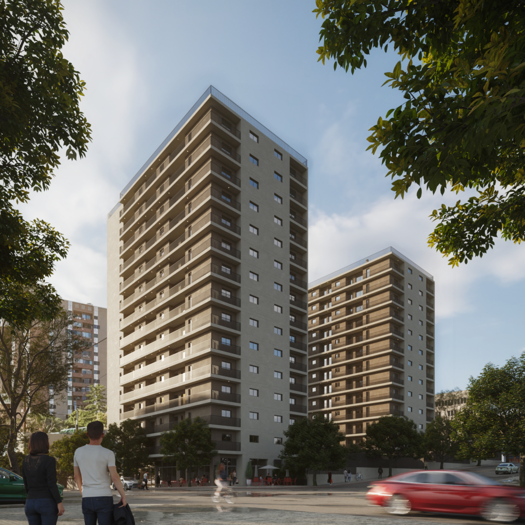 Complejo residencial en altura compuesto por cuatro torres con cocheras, espacios comunes, SUM y piscina